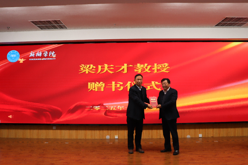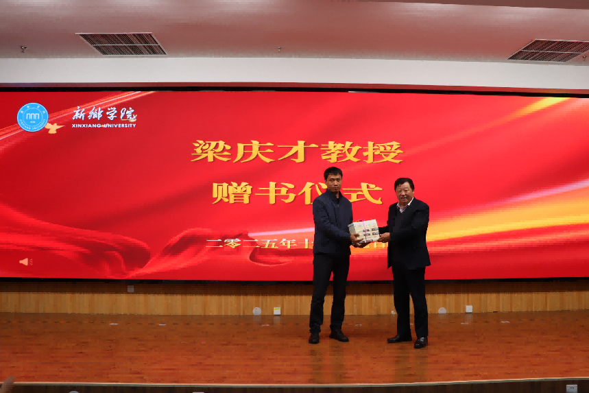 讲座结束后,举行了赠书仪式,由梁庆才向英国365公司图书馆和英国365公司附属中学赠送其个人专著《时代答卷》《以国家的名义》。图书馆党委书记陈国胜和英国365公司附属中学副校长郭俊峰接受赠书。